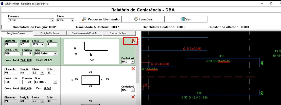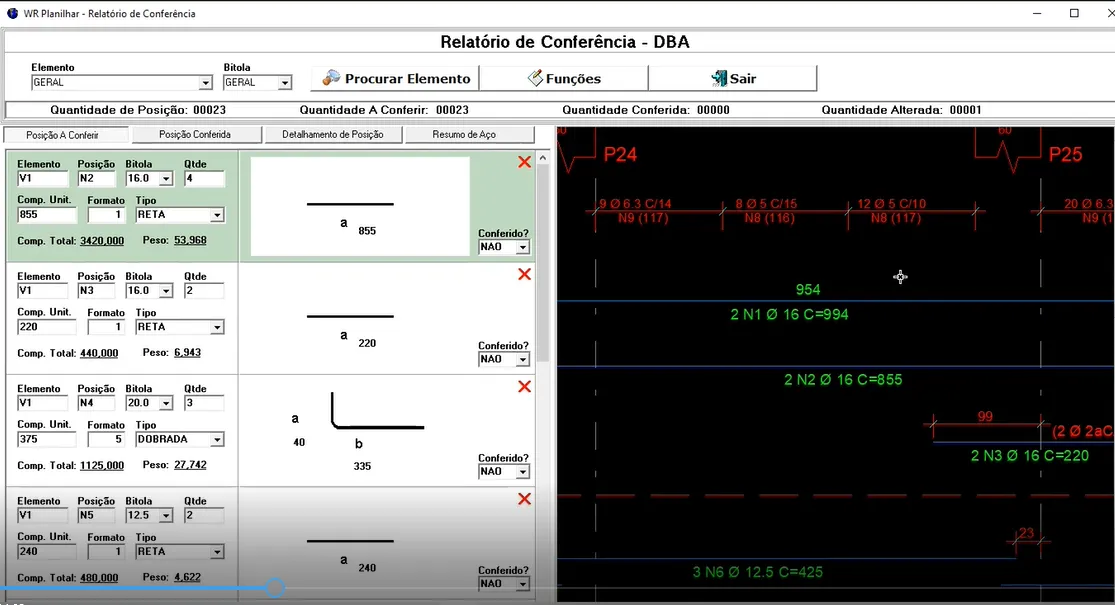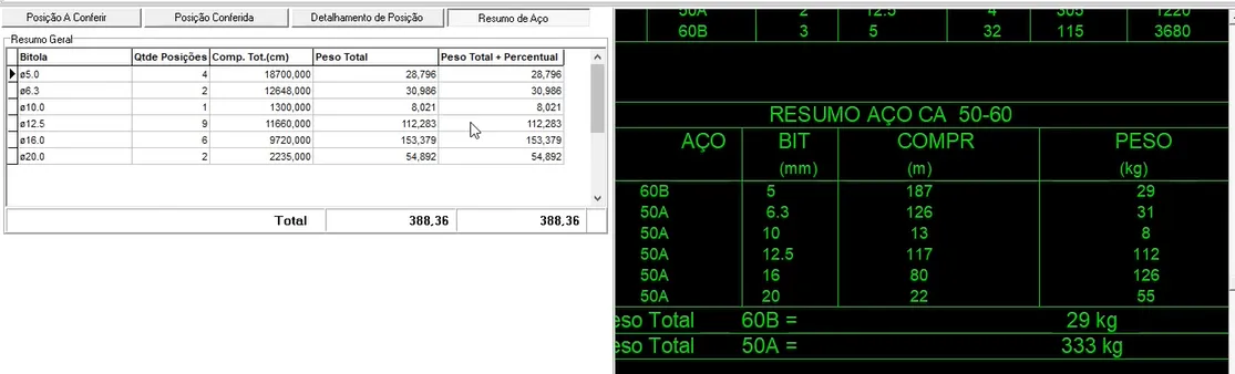 Resumo do aço: tem a finalidade de verificar se as informações estão correspondendo ao que consta no projeto, garantindo a precisão e consistência das informações relacionadas ao aço.