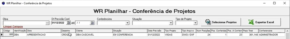 Nesta tela, é possível realizar a busca por projetos importados no WR. Ela exibe todas as situações dos projetos, como: aguardando conferência, em conferência, transferido parcialmente e transferido totalmente.