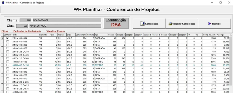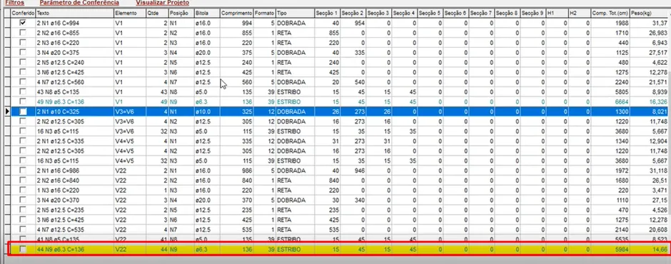 Já quando as letras e números na grade estão na cor verde-água, isso indica que o somatório das parciais/seções não coincide com o comprimento total.