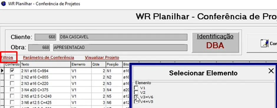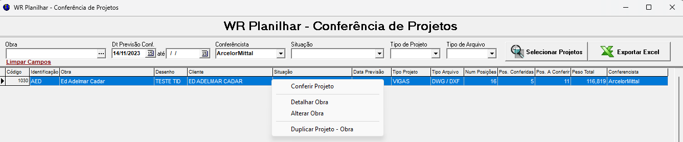 Ainda na tela da Conferência de Projetos, é possível alterarmos a obra caso tenha sido selecionada erroneamente pelo planilhador no inicio da importação do projeto. Basta clicar com botão direito em cima da gride e selecionar a opção: Alterar Obra.