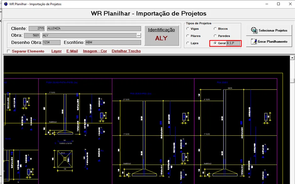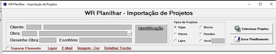 Tipo de Projeto: É importante especificar o tipo de projeto corretamente. Por exemplo, para projetos gerais que envolvem cintas, muros, sapatas, entre outros elementos, é necessário utilizar uma nomenclatura adequada conforme definida pelos credenciados. Por exemplo: Muros (M), Cintas (C), Sapatas (S). É fundamental selecionar o tipo de projeto correto para que o WR possa acionar os módulos correspondentes.