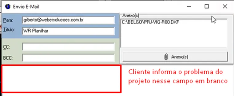 E-mail: Neste campo, é necessário informar a inconsistencia identificada ao selecionar o projeto e antes de enviar, informar o próprio e-mail no campo: CC.