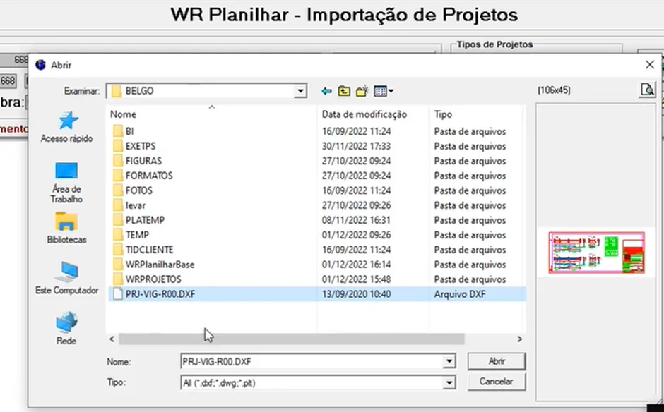 Ao importar um arquivo DWG, serão exibidas na tela de seleção da obra apenas as obras e clientes que estejam na situação "ATIVO", provenientes do Software Belgo Pronto ou Click Serviços. Em seguida, é necessário informar o desenho da obra e o escritório responsável pelo desenvolvimento do projeto. Essas informações são obtidas a partir do próprio projeto.
