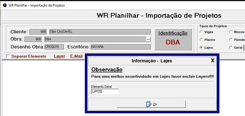 Lajes: No caso de projetos que envolvem lajes, é necessário diferenciar se são lajes positivas (LJPOS) ou lajes negativas (LJNEG). É importante separá-las corretamente.