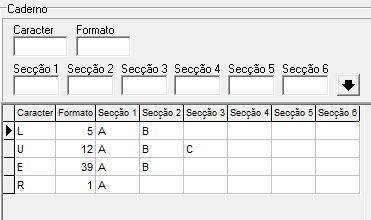 Posteriormente, deve-se inserir as letras referente ao formato no campo: Caracter, ao lado informar o cód. do formato e nos campos das secções informar as parciais adotadas na unidade. Após preenchimento desses dados deve-se clicar na seta para baixo. Segue exemplo abaixo: