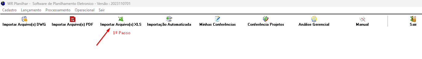 Com o projeto aberto no Adobe Acrobat, é necessário localizar as informações para planilhamento, selecionar essas informações, copiá-las e colá-las no espaço em branco localizado no campo: Processamento, na tela de importação XLS do WR Planilhar. Segue exemplo abaixo: