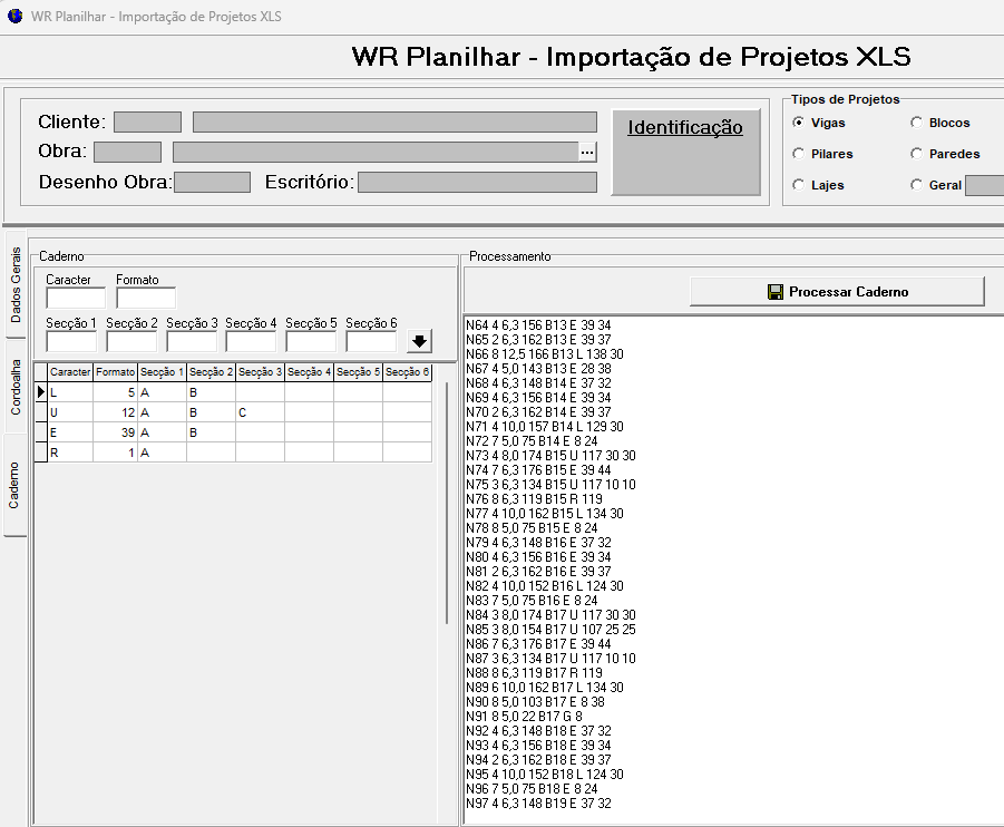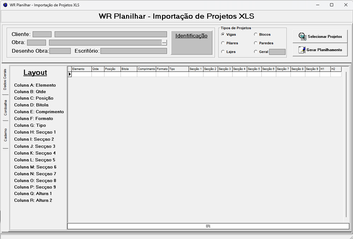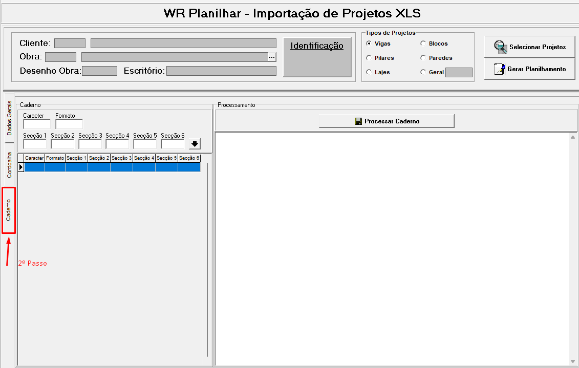 É possível tambem realizarmos o planilhamento de projeto em caderno nessa mesma tela de importação XLS, segue abaixo o passo a passo: